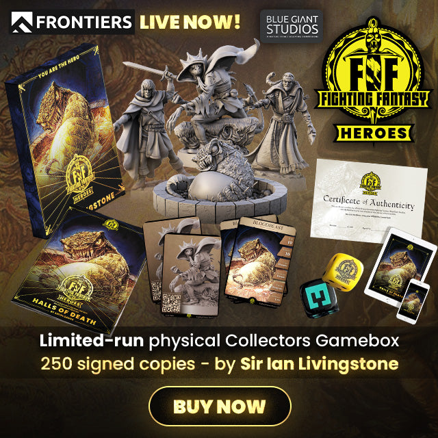 This FronTier is the first of its kind as MyMiniFactory are working with Sir Ian Livingstone and Blue Giant Studios to create a hybrid way for collectors and digital 3D printers to enjoy everything on offer in this Fighting Fantasy campaign. Expand your Fighting Fantasy collection with 40+ new, remodeled, and exclusive models from Blue Giant Studios, an RPG adventure written especially for the campaign, dice and more, all wrapped up in a signed box by Sir Ian Livingstone.